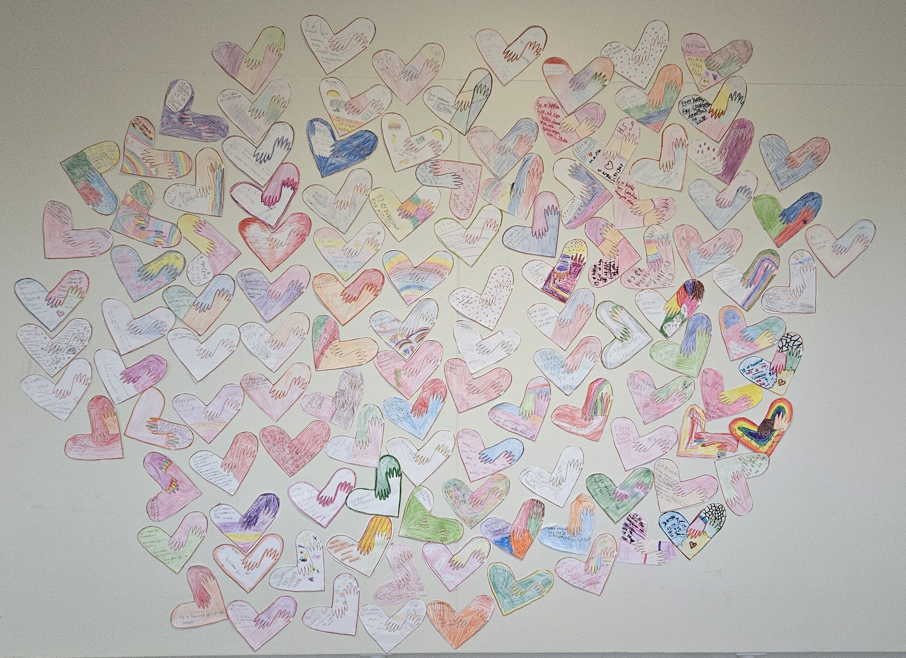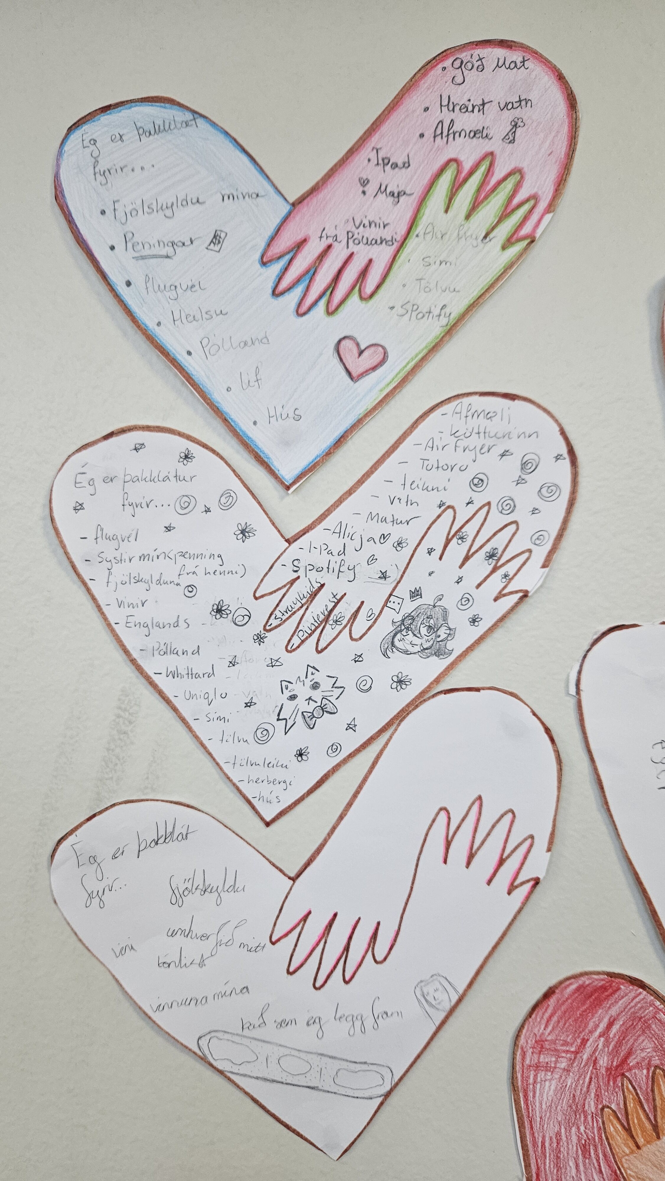 Nemendur fengu mynd af höndum sem mynduðu hjarta, vekja hlýjar tilfinningar og gætu jafnvel minnt á faðmlag. Inn í hjartað skrifuðu og svöruðu nemendur spurningunni: "Hvað ertu þakklát/ur fyrir?"