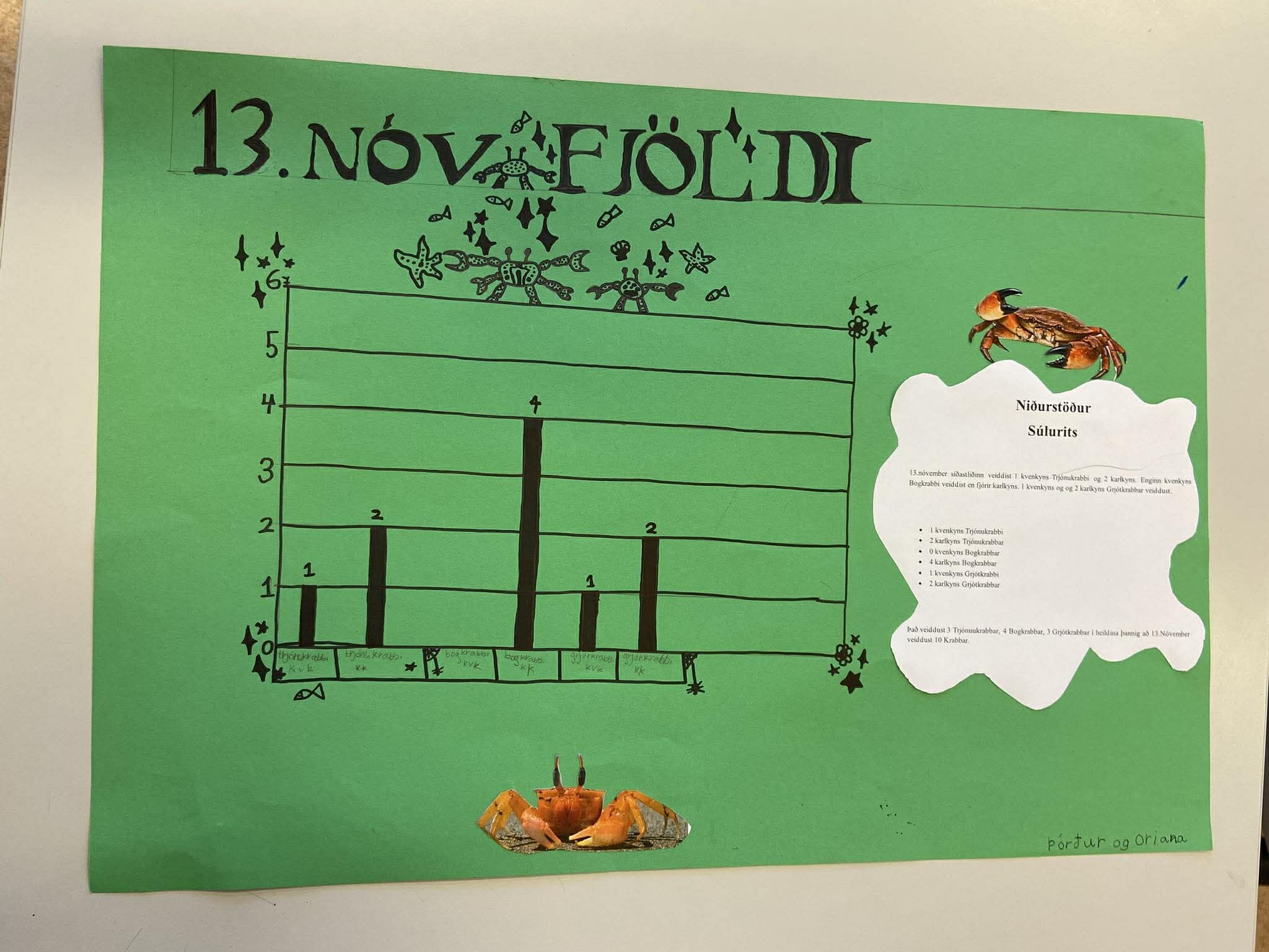 Þau gerðu skýringarmynd og plaköt i hópavinnu með 6. og 7. bekk. Á þessum plakötum komu fram allskonar upplýsingar t.d. fjöldi krabba, meðalstærð, tegundir krabba og fleira.
